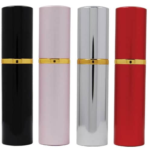 Pepper Shot 1.2% MC ½ oz lipstick pepper spray black. It’s designed for women. Pepper Shot Pepper Spray is made with 1.2% Major Capsaicinoids. The Major Capsaicinoids are the true heat measure and Pepper Shot 1.2% MC is more effective than of most other pepper sprays. In addition to causing an attacker pain, The Pepper Shot 8.5% oleoresin capsicum formula swells the mucous membranes, which makes breathing difficult, and swells the veins in the eyes, causing the eyes to close. It’s made from 2,000,000 SHU’s of raw pepper and these effects can last up to 45 minutes and cause no permanent damage. Has a UV identifying dye to help aid in the identification of an attacker. This lipstick model is designed for women. The attractive lipstick case is sure to deceive and ward off potential attackers. Pretend you need to freshen your lipstick and POW! This ½ oz canister contains 6-10 one-second sprays with a range of 6-8 feet and is available in 4 colors – Black, Pink, Red, and Silver – 4″ x ½”